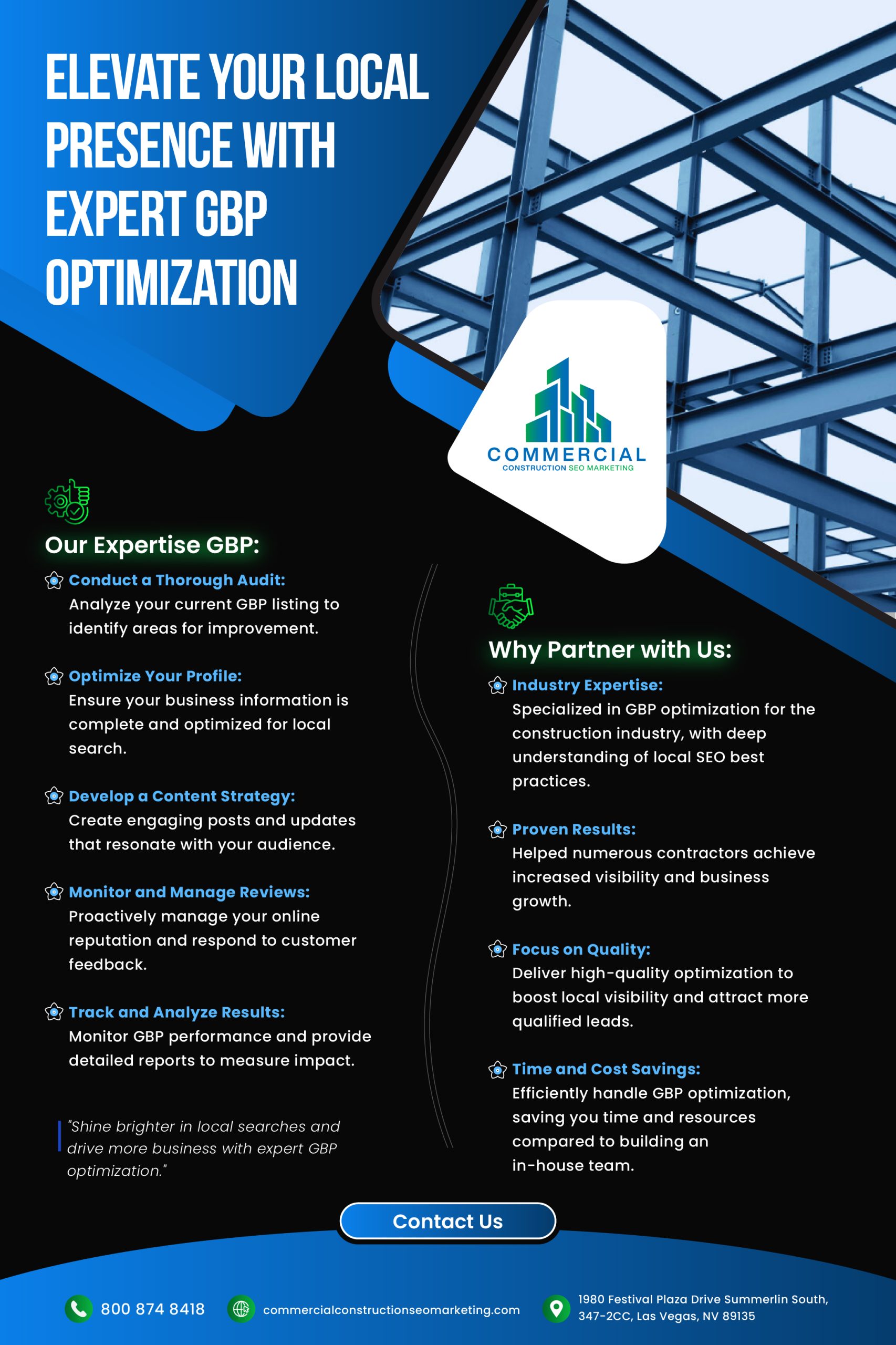 By partnering with Commercial Construction SEO Marketing, you gain access to a team of professionals who specialize in GBP optimization for the construction industry. We’ll help you claim your spot at the top of local search results and attract more qualified leads.